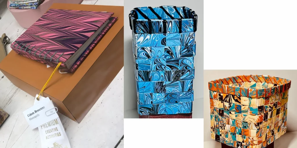 Celeste Brosenne and Gail Steward had their work displayed at the State Fair. Celeste submitted a journal with marbled covers and Gail submitted two baskets made of marbled papers (a technique she learned at the Textile Center).